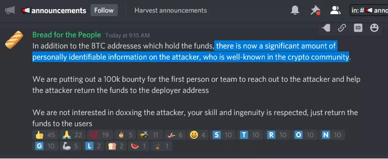 在其Discord频道上发布的消息中,Harvest Finance声称该攻击“为攻击者留下了大量个人识别信息”,并将其描述为“在加密社区中众所周知”。