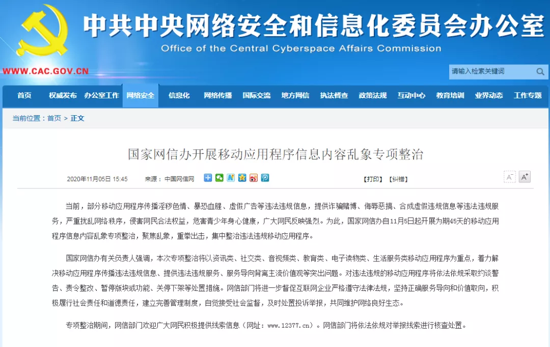 当前,部分移动应用程序传播淫秽色情、暴恐血腥、虚假广告等违法违规信息,提供诈骗赌博、侮辱恶搞、合成虚假违规信息等违法违规服务,严重扰乱网络秩序,侵害网民合法权益,危害青少年身心健康,广大网民反映强烈。为此,国家网信办自11月5日起开展为期45天的移动应用程序信息内容乱象专项整治,聚焦乱象,重拳出击,集中整治违法违规移动应用程序。