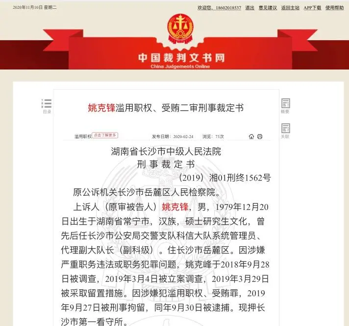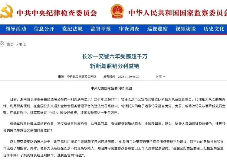 “在发现姚克锋违纪违法的情况后,我们督促市交警支队进行摸底排查,完善系统监督机制,健全交通管理领域的监管。”长沙市纪委监委驻市公安局纪检监察组副组长朱志军说。长沙市交警支队已加强对工作人员的账号管理,规定同一权限办事人员各掌握一部分登录密码,并不断优化办事平台。平台若发现工作账号存在时段、地点登录异常或记录重复时,会自动报警。(文章来源:南方都市报,资料来源:中央纪委国家监委、廉洁长沙、中国裁判文书网)