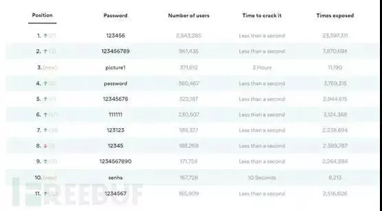 从调查结果中可以看到,占据前五名的分别是123456、123456789、picture1、password 和 12345678。除了picture1以外,其他几个常见的密码不用1秒就会被破解,毫无安全性可言,却仍被很多人使用。