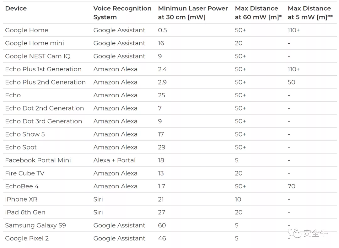 2019年,这个安全团队发现仅仅使用激光指示器就能从110米外向各种流行语音助手(包括Amazon Alexa、Apple Siri、Facebook Portal和Google Assistant)上的MEMS(微机电系统)麦克风发出人耳听不到的“光指令”。