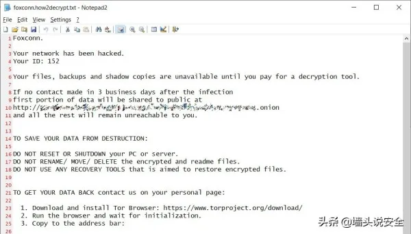 消息人士还分享了勒索软件攻击期间富士康服务器上创建的勒索条,如下所示。