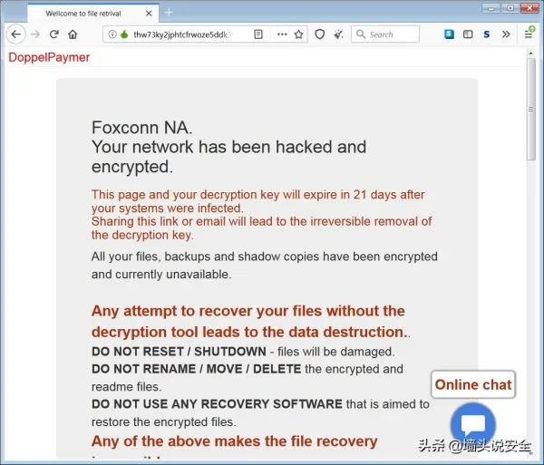勒索团伙在接受DoppelPaymer采访时证实,他们在11月29日袭击了富士康在北美的工厂,但没有攻击整个公司。
