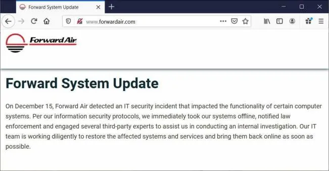 此时,Forward Air的网站已关闭,只是显示了一条关于“IT安全事件”的消息,并且该网站在恢复受影响的系统时已关闭。