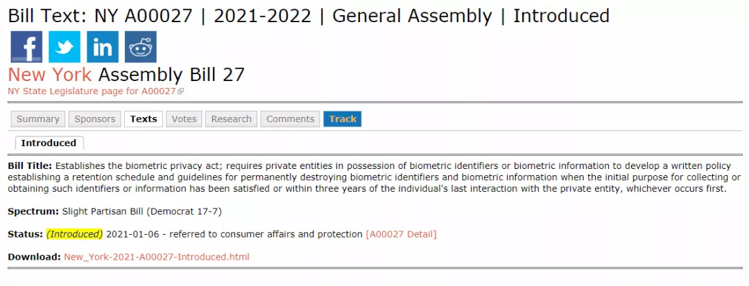 纽约议会第27号法案旨在修改有关生物特征隐私的法律。该计划于已提交消费者事务及保护委员会。