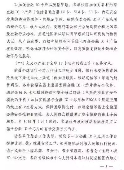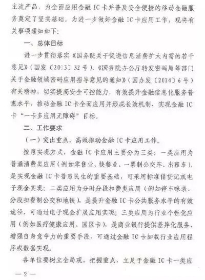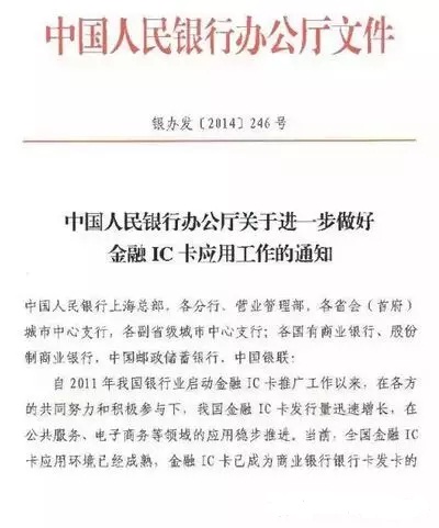 为进一步贯彻落实党中央、国务院关于推动金融普惠发展、促进信息消费扩大内需、增强信息技术安全可控能力有关精神,切实提升金融IC卡的普惠性、便捷性和使用质量,2014年11月3日人民银行印发了《关于进一步做好金融IC卡应用工作的通知》(以下简称《通知》)。