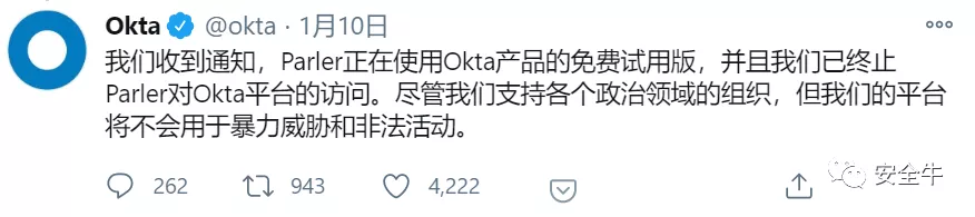 Parler大规模数据泄露的“罪魁祸首”是Twillio,这家为Parler提供2FA双因素认证服务(短信验证)的企业与谷歌和苹果公司一起,停止了对Parler的服务,更糟糕的是身份保护服务提供商Okta也停止了对Parler的服务,这意味着一场网络安全灾难。