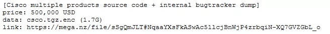 1.7G 的思科多产品源代码及内部错误跟踪转储被黑客在网站上出售,定价为 50 万美元。