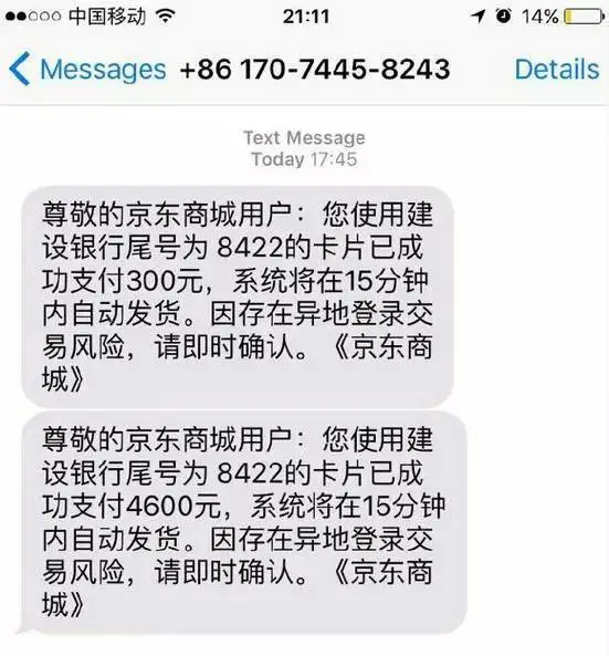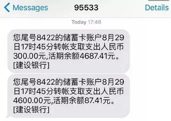 8月29日下午5点46分,突然收到来自建行的短信,提示我的储蓄卡被转账支出300元,紧接着又有一笔转账支出4600元。