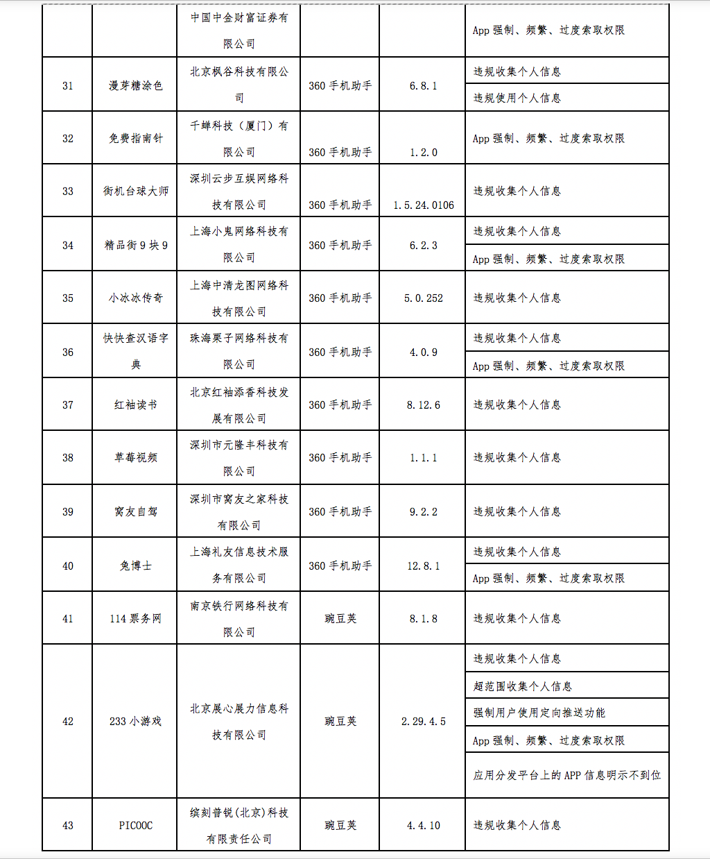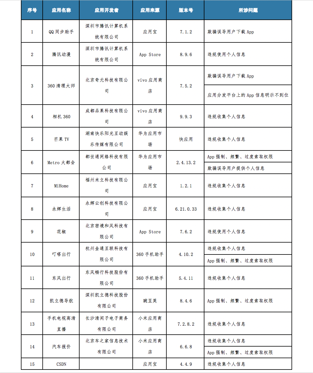此外,在我部组织的十批次检测中,腾讯应用宝、小米应用商店、豌豆荚、OPPO软件商店、华为应用市场发现问题分别占比22.3%,12.0%,10.3%,9.9%,8.8%,平台管理主体责任落实不到位。我部已督促相关平台企业严格落实《移动智能终端应用软件预置和分发管理暂行规定》(工信部信管〔2016〕407号)要求,落实企业主体责任。