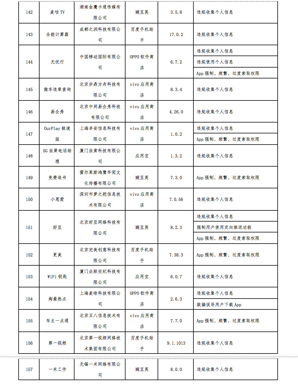 依据《网络安全法》《电信条例》《电信和互联网用户个人信息保护规定》等法律法规,按照《关于开展纵深推进APP侵害用户权益专项整治行动的通知》(工信部信管函〔2020〕164号)工作部署,我部近期组织第三方检测机构对手机应用软件进行检查,督促存在问题的企业进行整改。截至目前,尚有157款APP未完成整改(详见附件),上述APP应在1月29日前完成整改落实工作。