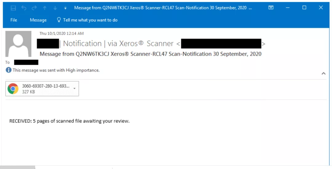 该活动自8月以来一直处于活跃状态,攻击者使用伪装成Xerox扫描通知的电子邮件,敦促收件人打开恶意HTML附件。这一操作使攻击者可以绕过Microsoft Office 365高级威胁防护(ATP)过滤,并成功地收集到了超过一千条Office 365企业账号的登录凭证。