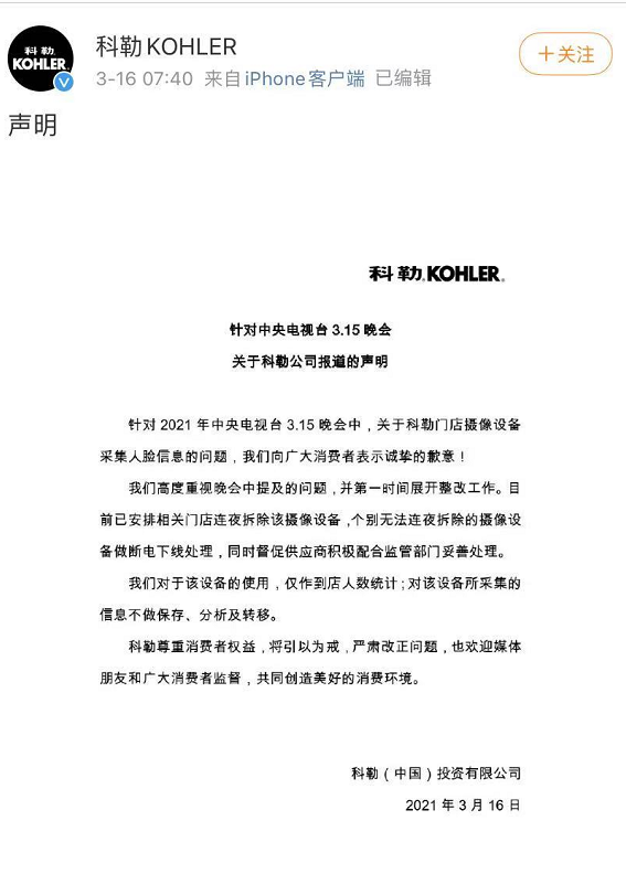 科勒连夜拆除摄像设备,个别无法连夜拆除的设备做断电下线处理,并承诺对该设备的使用仅作到店人数统计,对采集的信息不做保存、分析及转移。