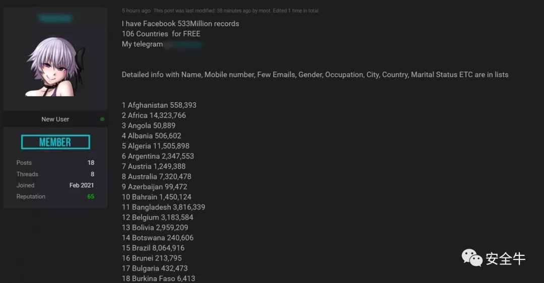 2020年6月,一个规模惊人的Facebook用户泄漏数据库首次在黑客社区中浮出水面,某黑客论坛成员开始将Facebook数据出售给其他成员。