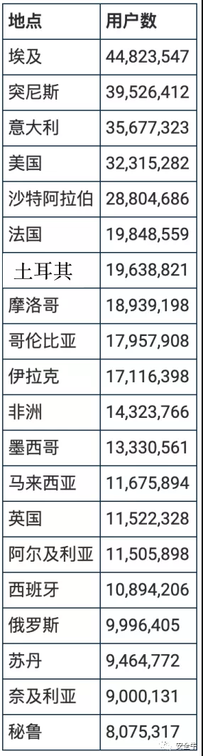下面列出泄漏用户数据最多的20个国家和地区(地理位置依据Facebook用户在其个人资料中输入的位置)。