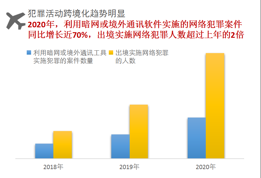 五是集团化、跨境化特征凸显。网络犯罪逐渐告别“单兵作战”模式,依附于网络黑灰产业,更多以团伙或集团形式作案。参加犯罪团伙甚至更大规模犯罪集团的网络犯罪嫌疑人,占犯罪总人数的83%。有的犯罪分子为逃避监管打击,将犯罪窝点、通讯工具等向境外转移,有目的性地针对我国公民实施跨境网络犯罪,网络犯罪中跨境实施的占13%。暗网和境外通讯软件在网络犯罪中的应用明显增多,2020年检察机关办理利用暗网或境外通讯软件实施的网络犯罪案件同比增长近70%,出境实施网络犯罪的人数超过上一年的2倍。