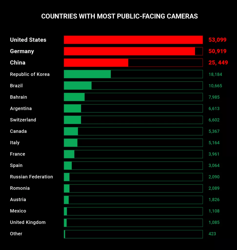 但是,美国和德国在人群中脱颖而出。尽管后者的人口为8300万,但那里的公共摄像头数量与拥有3.28亿人口的中国所见过的摄像头数量相似,是中国的两倍。