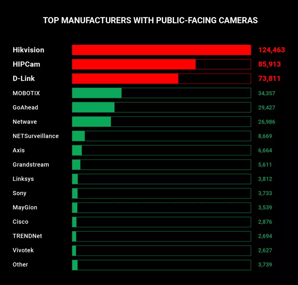 CyberNews团队的研究显示,相机制造商HIKVision在网络上拥有最多的面向公众的相机。全球有超过124,000台HIKVision摄像机在使用。该制造商是行业领导者之一。