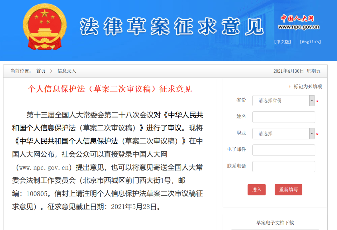 第十三届全国人大常委会第二十八次会议对《中华人民共和国个人信息保护法(草案二次审议稿)》进行了审议。现将《中华人民共和国个人信息保护法(草案二次审议稿)》在中国人大网公布,社会公众可以直接登录中国人大网(www.npc.gov.cn)提出意见,也可以将意见寄送全国人大常委会法制工作委员会(北京市西城区前门西大街1号,邮编:100805。信封上请注明个人信息保护法草案二次审议稿征求意见)。征求意见截止日期:2021年5月28日。