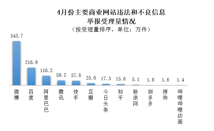 在全国主要网站受理的举报中,微博、百度、阿里巴巴、腾讯、快手、豆瓣、今日头条、知乎、新浪网、拼多多、搜狗、哔哩哔哩动画等主要商业网站受理量占77.6%,达1064.0万件。