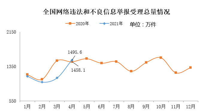 2021年4月,全国各级网络举报部门受理举报1495.6万件,环比增长38.4%、同比增长2.6%。其中,中央网信办(国家互联网信息办公室)违法和不良信息举报中心受理举报19.1万件,环比增长11.3%、同比下降26.7%;各地网信办举报部门受理举报105.9万件,环比下降0.1%、同比下降23.8%;全国主要网站受理举报1370.6万件,环比增长43.2%、同比增长6%。