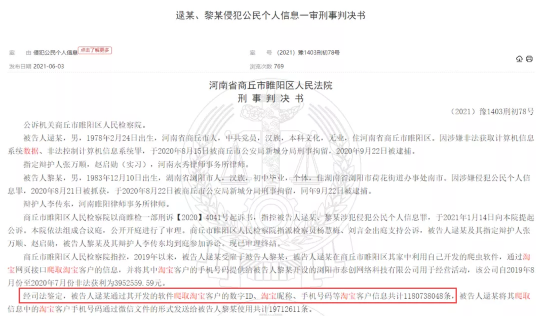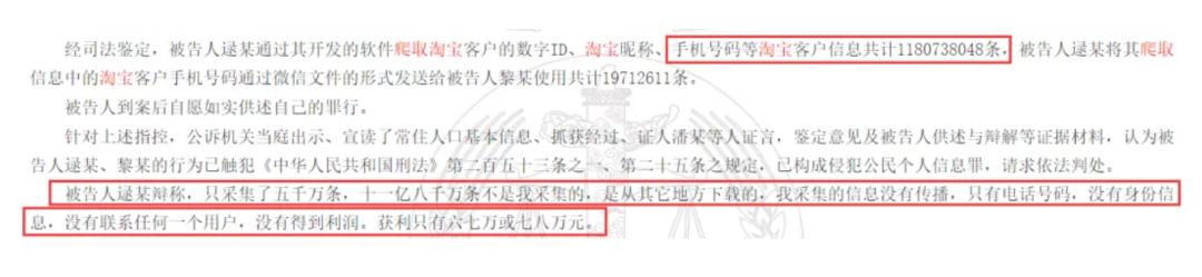 最终,逯某和黎某被河南警方逮捕。经过公检方面核查,逯某电脑里通过其开发的软件爬取淘宝客户的数字ID、淘宝昵称、手机号码等淘宝客户信息共计1180738048条。