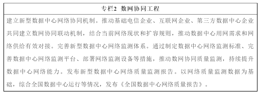《行动计划》提出了“网络质量升级行动”,推动升级网络质量,促进数网协同发展。重点聚焦国家、区域、边缘各级网络关键环节,着重推动网络质量提升。一是持续优化国家互联网骨干直联点布局,推进东西部地区数据中心网络架构和流量疏导路径优化,支撑“东数西算”工程。二是支持国家枢纽节点内的新型数据中心集群间网络直连,促进跨网、跨地区、跨企业数据交互。三是推动边缘数据中心间,及与新型数据中心集群间的组网互联,促进云、数、网协同发展。四是促进数网协同发展,通过建立数网协同联动机制,完善数据中心网络监测体系,发布网络质量监测报告等具体举措,持续推动数据中心网络需求和供给有效对接,不断提升数据中心网络支撑能力。
