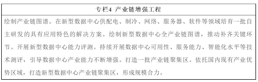 3.构建完善产业链体系。聚焦新型数据中心供配电、制冷、IT和网络设备、智能化系统等关键环节,锻强补弱。加强新型数据中心设施、IT、网络、平台、应用等多层架构融合联动,提升产业链整体竞争优势。推动新型数据中心与人工智能等技术协同发展,构建完善新型智能算力生态体系。