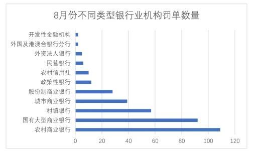 从银行类型来看,8月份农村商业银行领罚单最多,合计罚单数达109张,其次是国有大型商业银行、村镇银行、城市商业银行、股份制银行。农商行依然罚单数高企,村镇银行排名略上升、股份制银行罚单数排名略有下滑。可见农商行、村镇银行等农村金融机构依然是被处罚的重点对象。