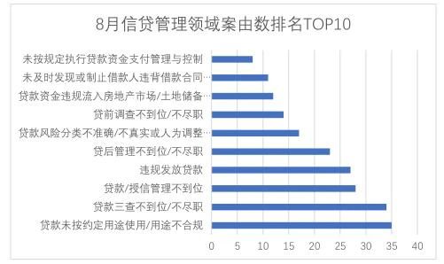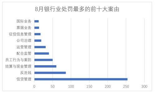 信贷管理依然是罚单最多的领域,8月份信贷管理领域案由出现了254次,遥遥领先,人民银行开的反洗钱和结算与现金管理领域罚单依然不少。