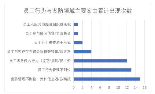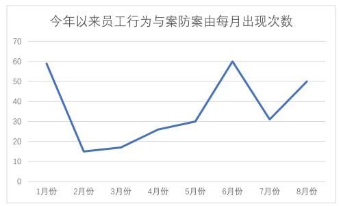 值得关注的是,8月份员工行为与案防领域案由累计出现次数的排名明显上升,累计出现次数达50次。从今年以来的数据来看,近4个月员工行为与案防领域案由累计出现次数均达到或超过30次以上,6月份累计出现次数达到60次,达到一个小高峰。