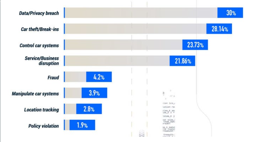 最常见的攻击是试图侵入汽车服务的服务器、使用钥匙卡、针对移动设备的汽车应用程序的攻击。另外还有针对信息娱乐系统、使用车载诊断(OBD)端口、针对制造商IT网络的攻击。