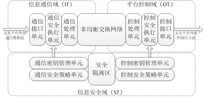无人系统的外联部分是IT域(Information Technology),如5G、WiFi、超短波、卫星链路等;平台控制属于OT域(Operational Technology),如CAN、LIN、ModBus、1553B等,IT域通信带宽高(1Mbps~100Mbps)但时延不敏感,一般高于10ms;OT域带宽较低(100kbps~2Mbps)但时延敏感,一般低于1ms。时延不敏感的高速通信和时延敏感的低速平台控制之间的非均衡性链接,以及数据交互的类型和安全等级的差异,导致了其对信息安全保障提出了不同以往的需求,传统的边界防御模式已无法适应和满足,需要将信息安全技术(Security Technology)嵌入其中,采用IT+ST+OT的非平衡架构和新的安全模型,体系性解决无人系统的信息安全问题。