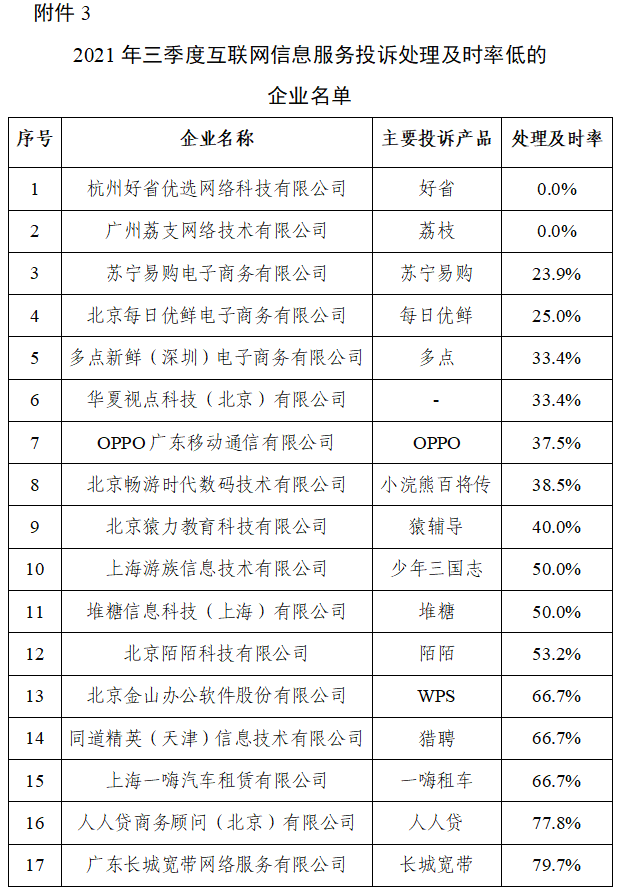 工业和信息化部同时指出,好省、荔枝等17家企业在互联网信息服务投诉平台中投诉处理及时率较低,目前已督促相关互联网企业抓紧提升处理及时率。(文章来源:工信部)