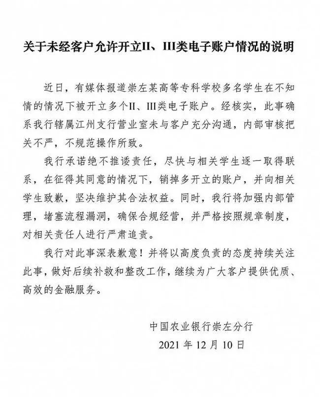 北青报记者注意到,声明的标题是“未经客户允许开立Ⅱ、Ⅲ类电子账户情况”。该分行在声明中将此事定义为,“确系我行辖属江州支行营业室未与客户充分沟通,内部审核把关不严,不规范操作所致。”该分行承诺绝不推诿责任,尽快与相关学生逐一取得联系,在征得其同意的情况下,销掉多开立的账户,并向相关学生致歉,坚决维护其合法权益。同时,将加强内部管理,堵塞流程漏洞,确保合规经营,并严格按照规章制度,对相关责任人进行严肃追责。