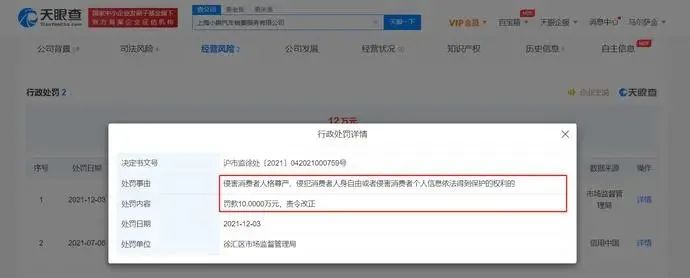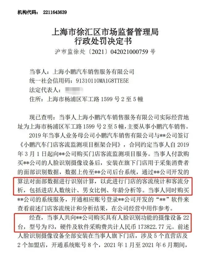 天眼查App显示,近日,上海小鹏汽车销售服务有限公司被徐汇区市场监督管理局罚款10万元。处罚事由为,当事人购买具有人脸识别功能的摄像设备22台安装在旗下门店,以此统计进店人数并分析男女比例、年龄等。
