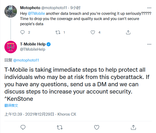 据报道,在 12 月的漏洞中暴露的信息不那么敏感(文件中说那些被调换 SIM 卡的客户已经重新获得了访问权),而且范围可能没有那么大。T-Mobile Help 官方发布推文:“T-Mobile 正在立即采取措施,帮助保护所有可能面临这一网络攻击风险的人。如果你有任何问题,请给我们发送DM,我们可以讨论如何提高你的账户安全”。(文章来源:cnBeta.COM)