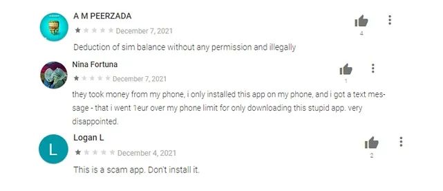 该应用程序非常简洁的条款和条件托管在一个无品牌的单页博客上,并且条款中不会透露该应用程序可以在用户设备上执行的操作的范围。其中一名受害者甚至试图通过法律页面的评论部分联系应用程序的开发者,其他用户则直接在商店应用程序的评论部分抱怨欺诈行为。