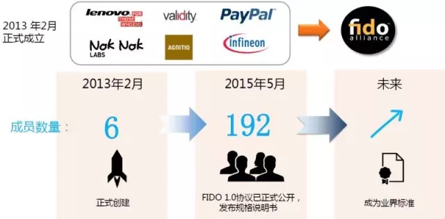 FIDO联盟理事会成员包括全球领先企业:阿里巴巴、美国运通、ARM Holdings、美国银行、CrucialTec、Egis、谷歌、英特尔、荷兰国际集团、英飞凌、联想、VISA、万事达、微软、诺克诺克实验室、NTT、恩智浦半导体、Oberthur Technologies OT、PayPal、高通、RSA、三星电子、新思、USAA、VASCO。