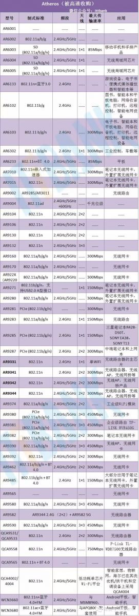 一起来看看高通AtherosWiFi芯片型号及其参数一览: