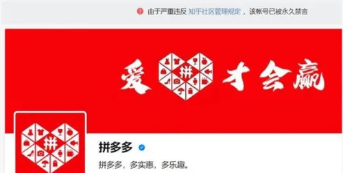 1月5日,根据网友爆料,知乎网页显示,由于违反知乎社区管理规定,拼多多的知乎官方账号被禁言15天。