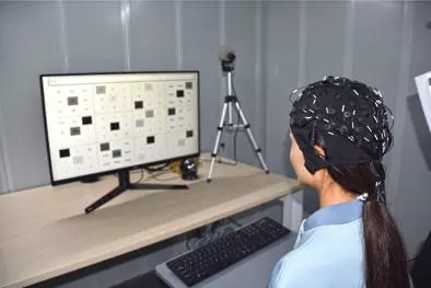 在天津大学某实验室内,一块布满字符和符号的屏幕上,黑色方块频繁闪烁。一名男生佩戴着布满灵敏电极的黑色脑电极帽,紧盯屏幕,在无需双手操作的情况下,通过“意念”“隔空打字”,将字符输入指定区域。