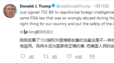 美特朗普签署外国情报监控法FISA 授权情报部门继续监听外国情报信息