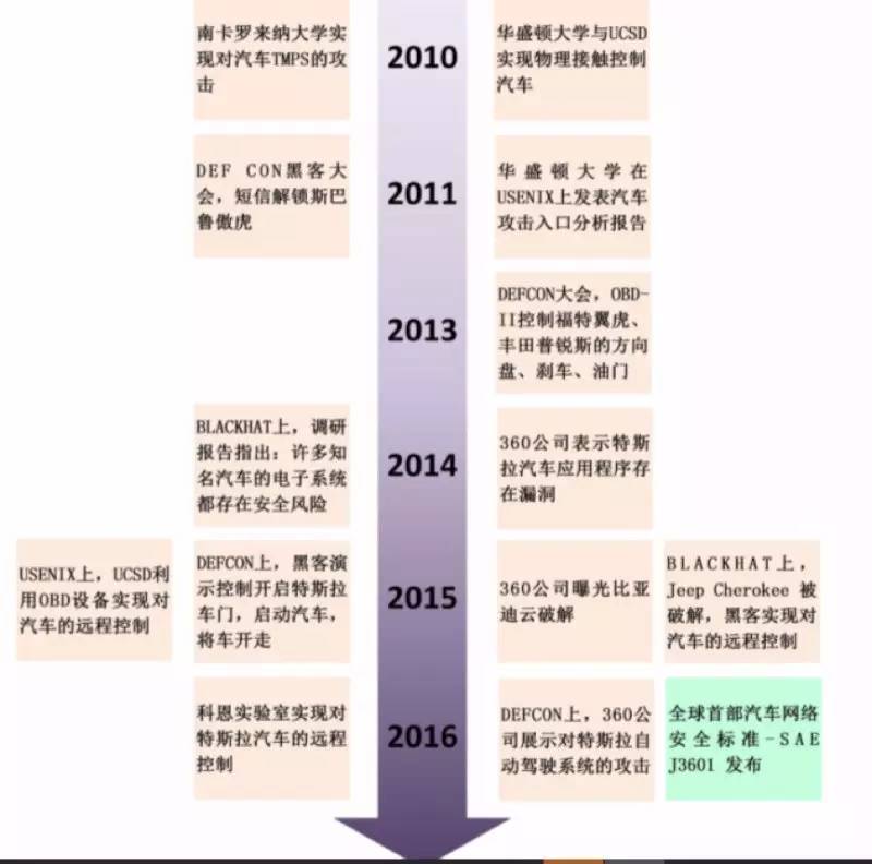随着 2015 年 7 月两位著名白帽黑客查理·米勒以及克里斯·瓦拉塞克入侵了一辆 Jeep 自由光行驶过程的经典案例曝光,大家对汽车的安全性能提出了大大的问号。两位黑客侵入克莱斯 勒公司出品的Uconnect车载系统,远程通过软件向该系统发送指令,启动车上的各种功能。此外,宝马ConnectedDrive数字服务系统遭入侵事件,黑客能够利用该漏洞以远程无线的方式侵入车辆内部,并打开车门。特斯拉Model S遭入侵事件,研究人员通过Model S存在的漏洞打开车门并开走,同时还能向Model S发送“自杀”命令,在车辆正常行驶中突然关 闭系统引擎。此外,奥迪、保时捷、宾利和兰博基尼等大众旗下品牌的 MegamosCrypto 防护系统也遭到攻破。