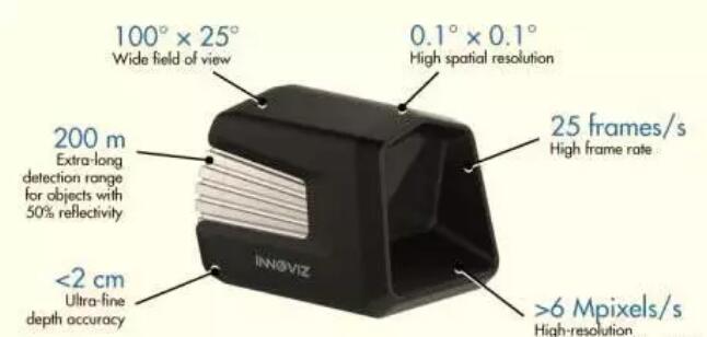 InnovizOne具有200米的深度精度优于2厘米的范围。它保持100度~25度的视场,0.1~0.1度的空间分辨率。该设备以超过6 Mpixels/s的3D分辨率提供25帧/秒。