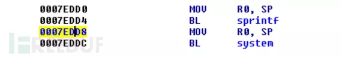 在模拟攻击中,研究员使用两个溢出来调用“系统”函数,并指定了要执行的命令。为此,他们会使用位于地址 0x0007EDD8 的 ROP 工具。这会将栈指针的地址改为 R0,之后调用系统函数。跳转到 ROP 中,栈指针就会指向返回地址所在之处。