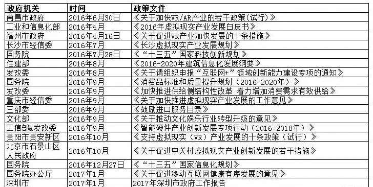 2016年12月,国务院发布《“十三五”国家战略性新兴产业发展规划》,其中多次提及虚拟现实与增强现实等新兴技术,明确提出要创新数字文化创意技术和设备,加快VR(虚拟现实)、AR(增强现实)、全息成像、裸眼3D、交互娱乐引擎开发、互动影视等核心技术的创新发展。