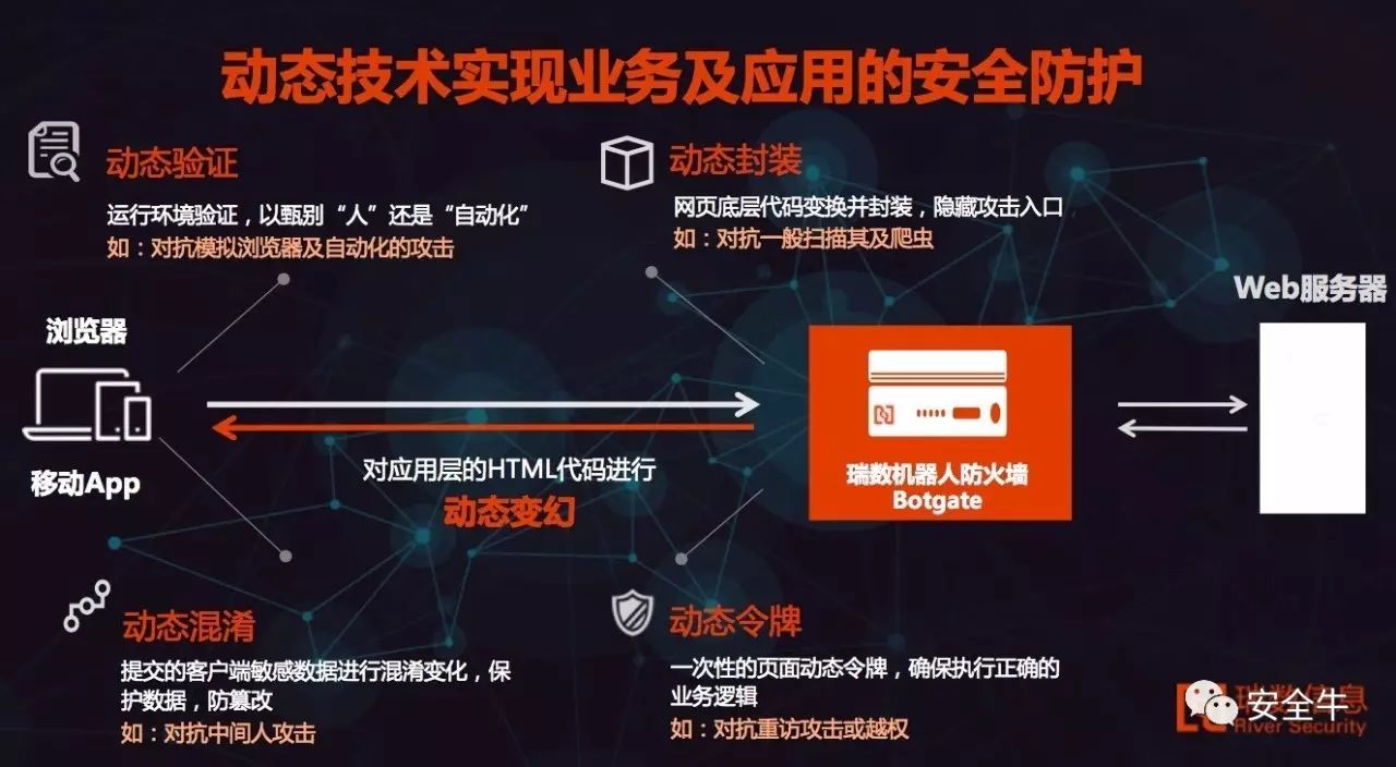 去年10月,基于动态验证、封装、混淆、令牌等动态技术实现对业务数据和交易环境进行保护的瑞数信息,其“动态安全”理念与IDC此次提出的“主动防御”在防护思路不谋而合。而瑞数在今年年初发布的一款针对自动化工具发起的攻击的安全产品——机器人防火墙 (botgate),更可以看做是“主动防御”这一安全理念的一种落地。