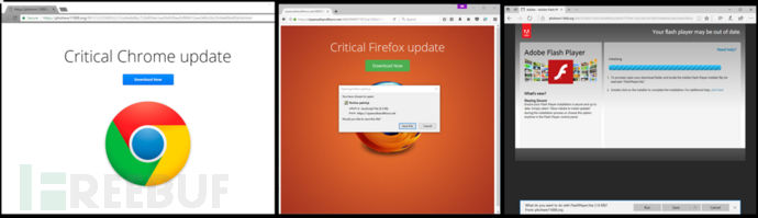 比如说,当用户使用Chrome或Firefox访问这个网页时,网站会询问用户是否需要下载浏览器更新补丁,如果用户使用的是IE或Edge浏览器的话,该网站则会询问用户是否需要下载Flash更新。