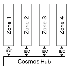 Hub既是中继链。Zone之间的跨链通信主要是通过与Hub之间的IBC协议来实现。Zone1向Zone2做跨链消息时,Zone1先生成消息包,并将其证明发布在Hub上,接下来Hub会生成Zone1的跨链消息包已在Hub上的存在证明的证明发布于Zone2,接下来Zone2收妥消息包,并给出证明发布于Hub上,最后,Hub再给出Zone2的收妥证明的证明发布于Zone2。完成整个跨链消息传递。